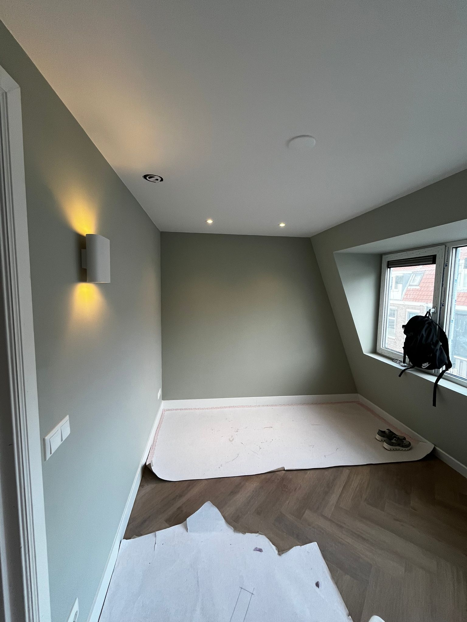 Volledige slaapkamer renovatie met hoogwaardige afwerking, moderne verlichting en op maat gemaakte kasten. Transformatie van een oude ruimte naar een luxe slaapkamer.