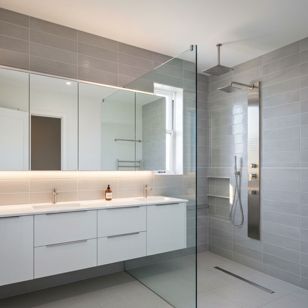 Moderne badkamer met luxe marmer-look tegels, regendouche, zwevend toilet, maatwerk wastafelmeubel en sfeervol LED-verlichting. Complete loodgieterswerkzaamheden.