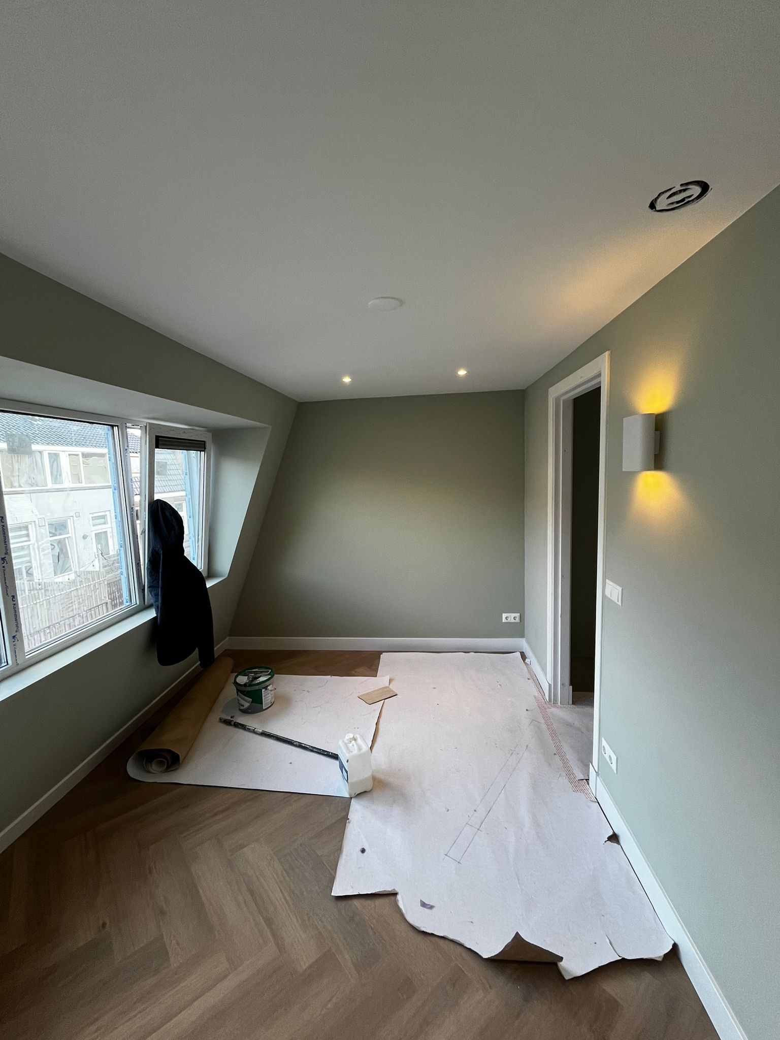 Volledige slaapkamer renovatie met hoogwaardige afwerking, moderne verlichting en op maat gemaakte kasten. Transformatie van een oude ruimte naar een luxe slaapkamer.